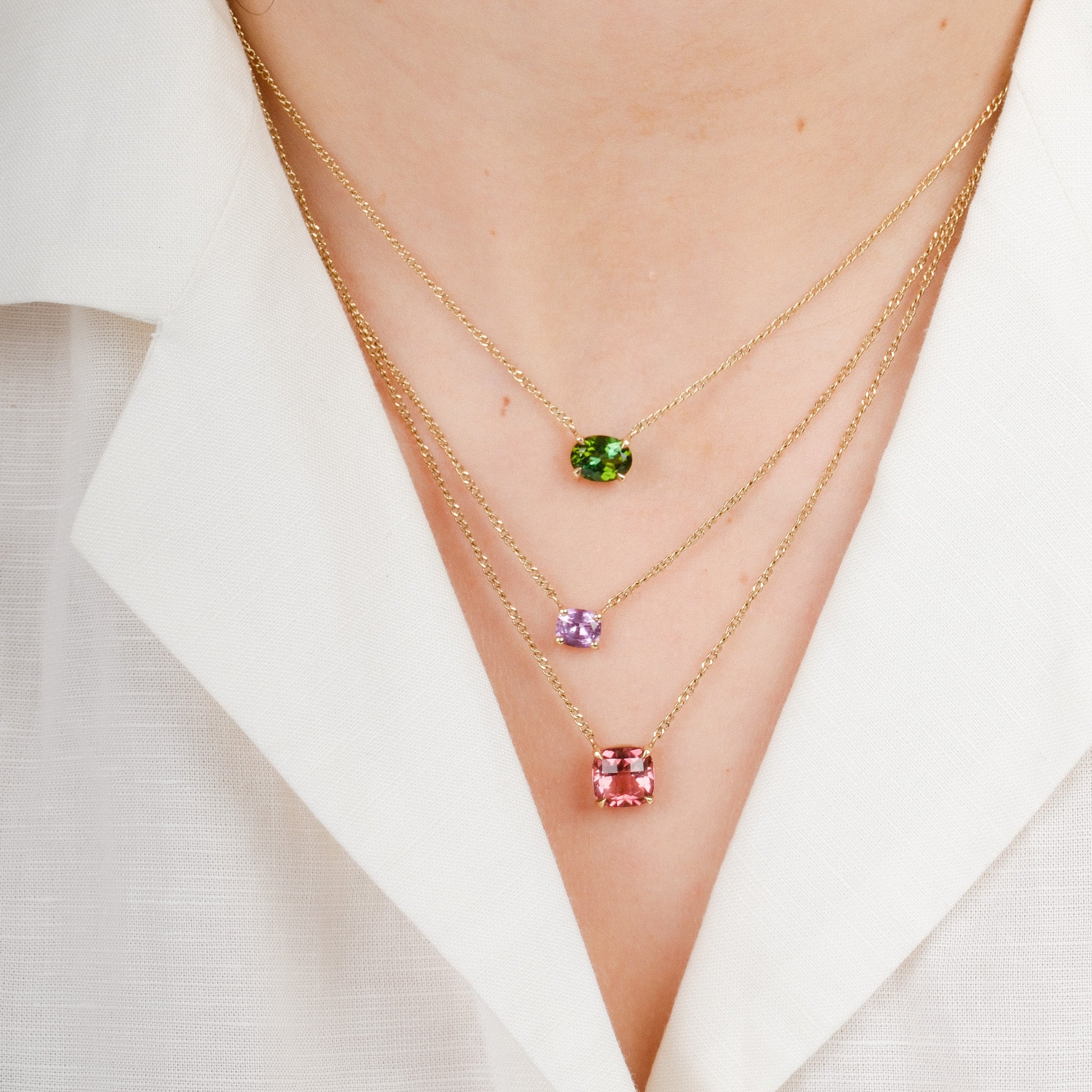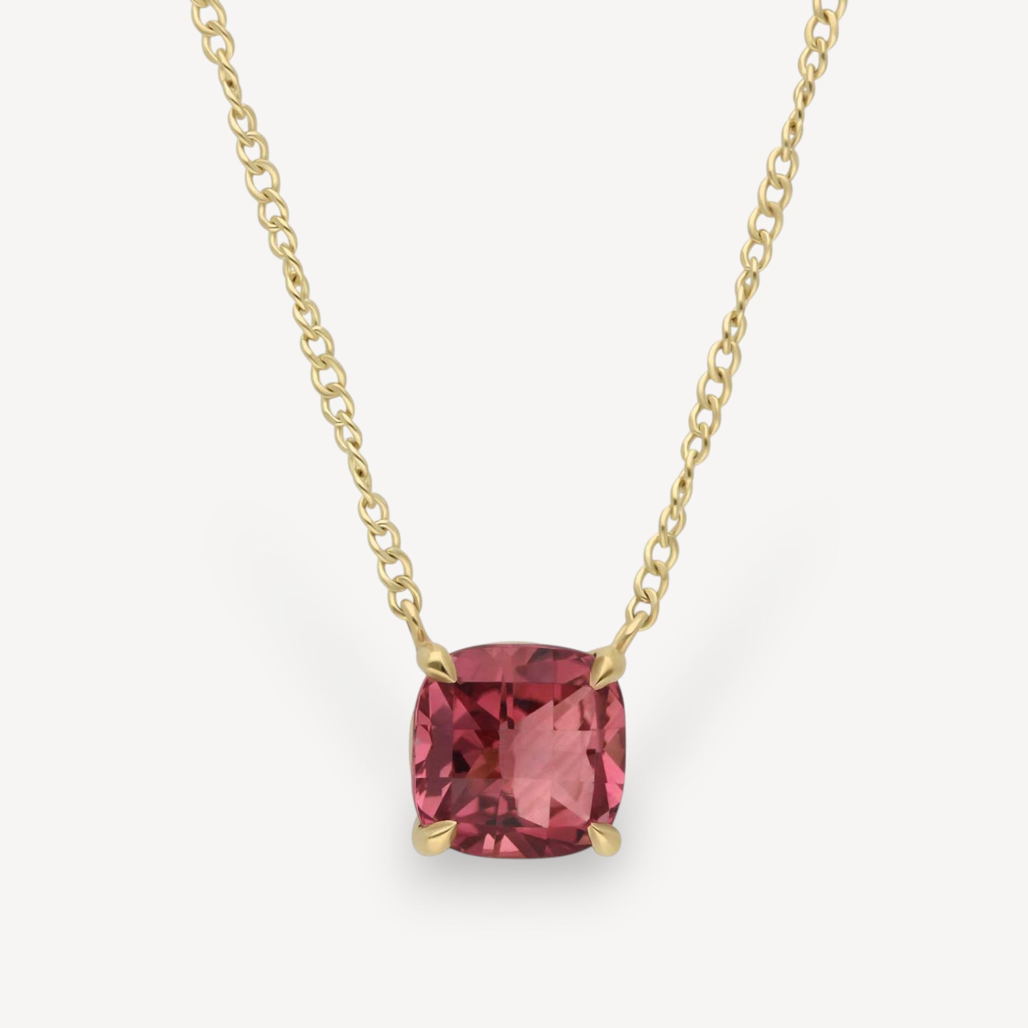 This gorgeous pink tourmaline is given a modern look with its subtle talon claws. The twisted curb chain adds a little sparkle too.