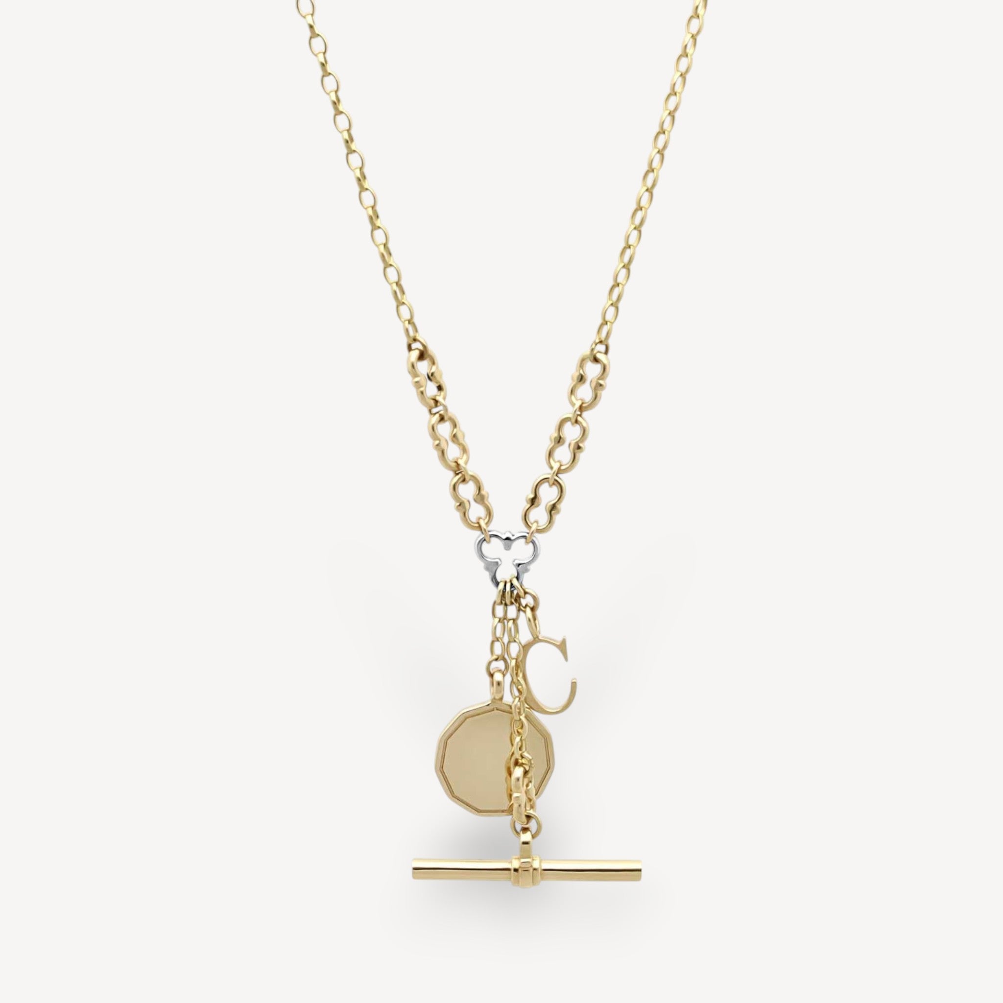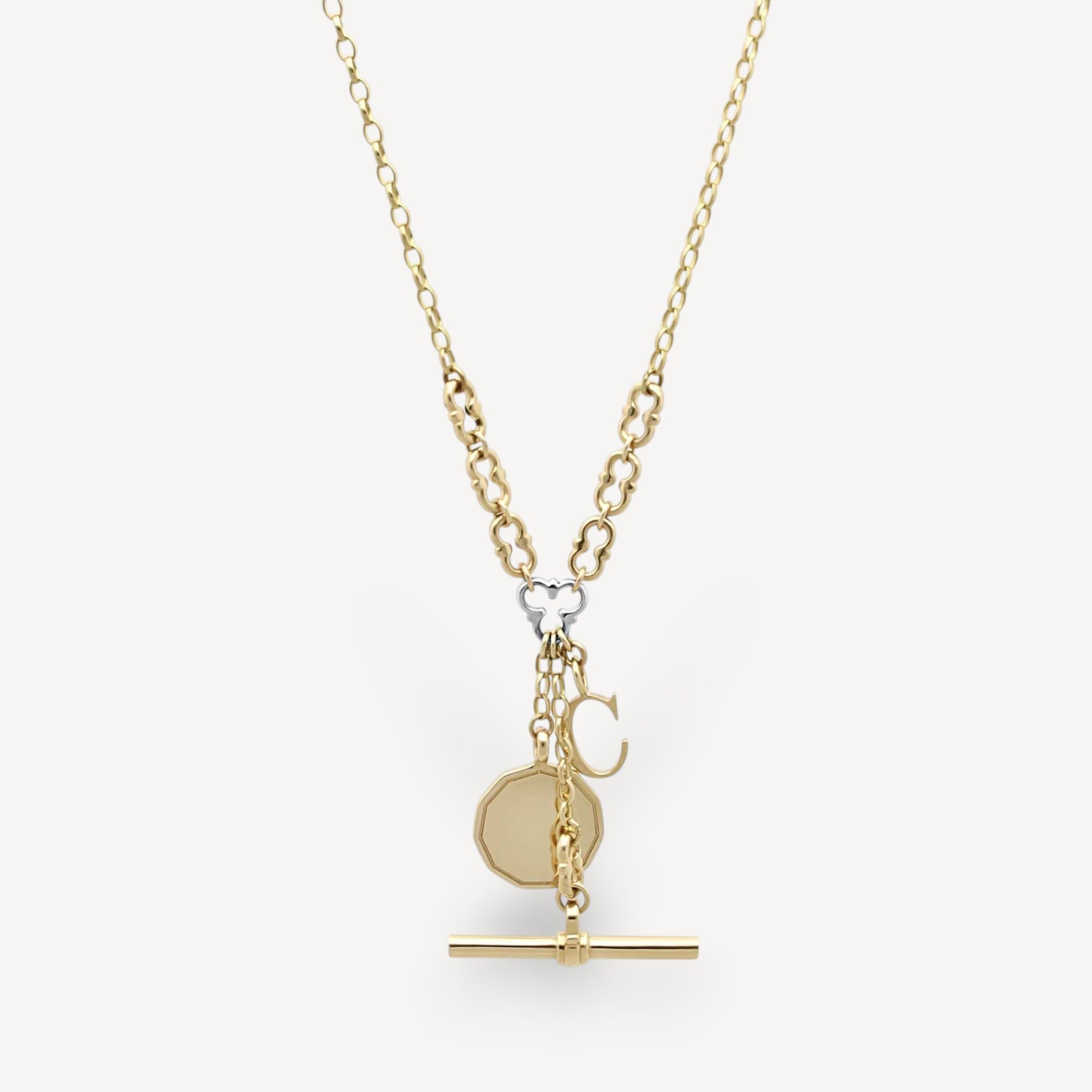 Our Myddelton chain has our lovely signature links and T-bar with added charms to make it your own. Let us know which initial you would like and we will personalise the necklace for you.