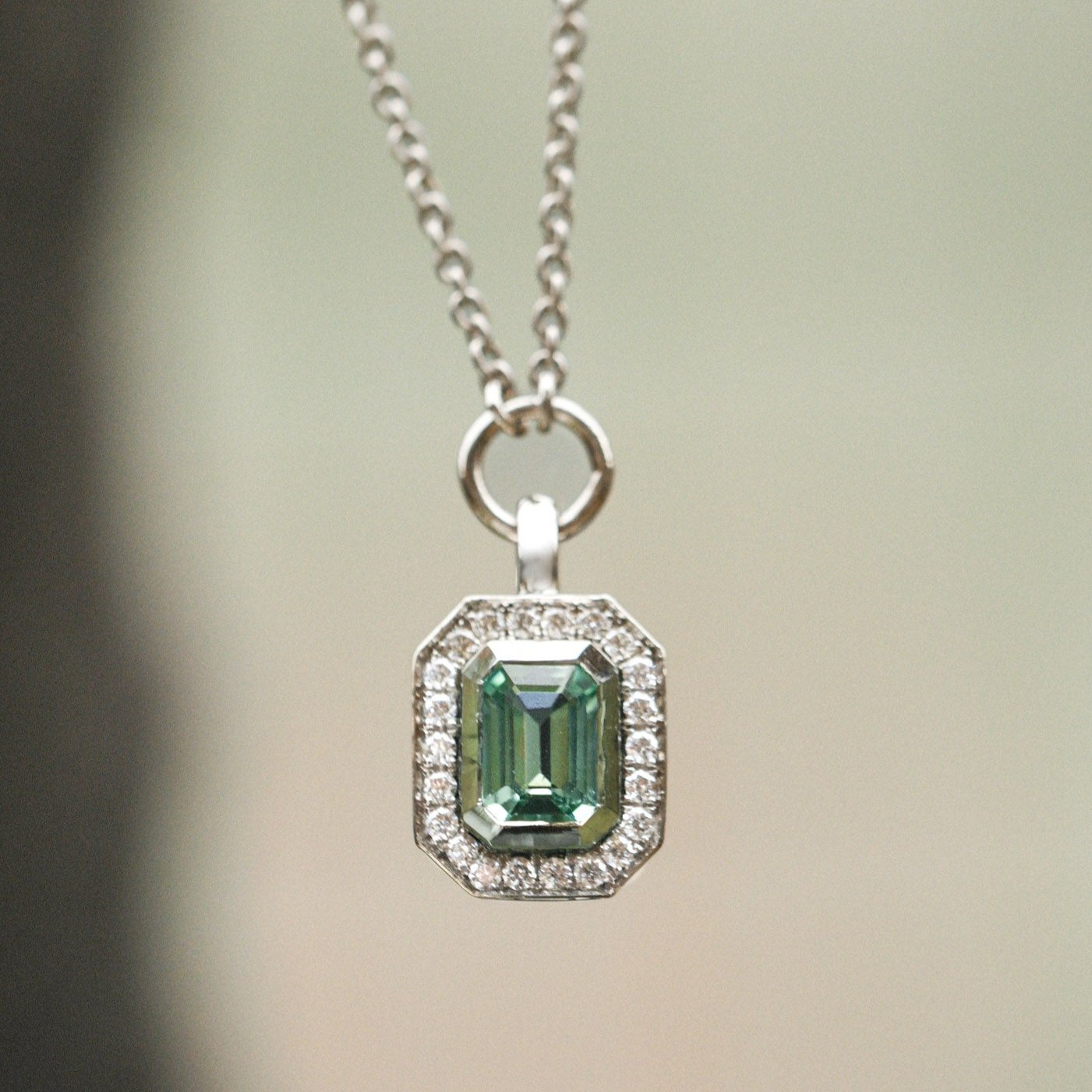 This necklace is set with a beautiful mint green Tourmaline and surrounded by a halo of white diamonds. The pendant and gemstone have a lovely movement to them and are easy to wear.
