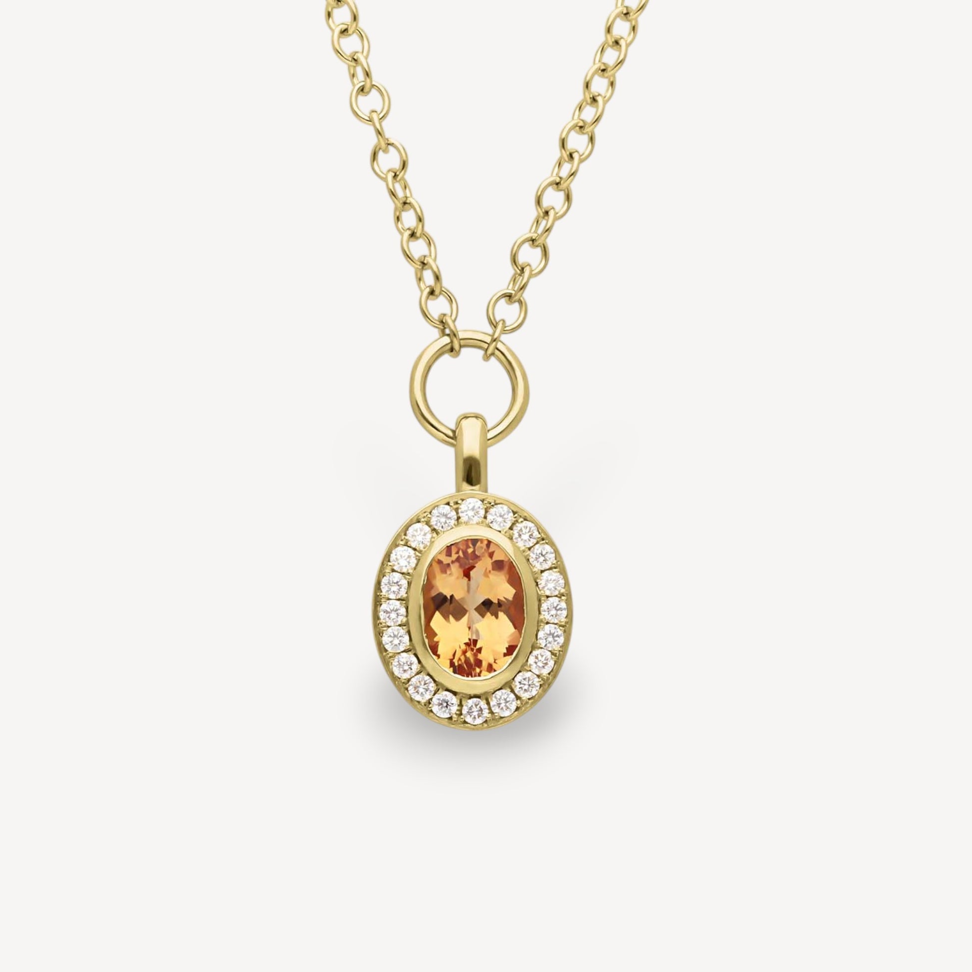 This necklace is set with a stunning golden Topaz surrounded by a halo of white diamonds. The pendant and gemstone have a lovely movement to them and are easy to wear.