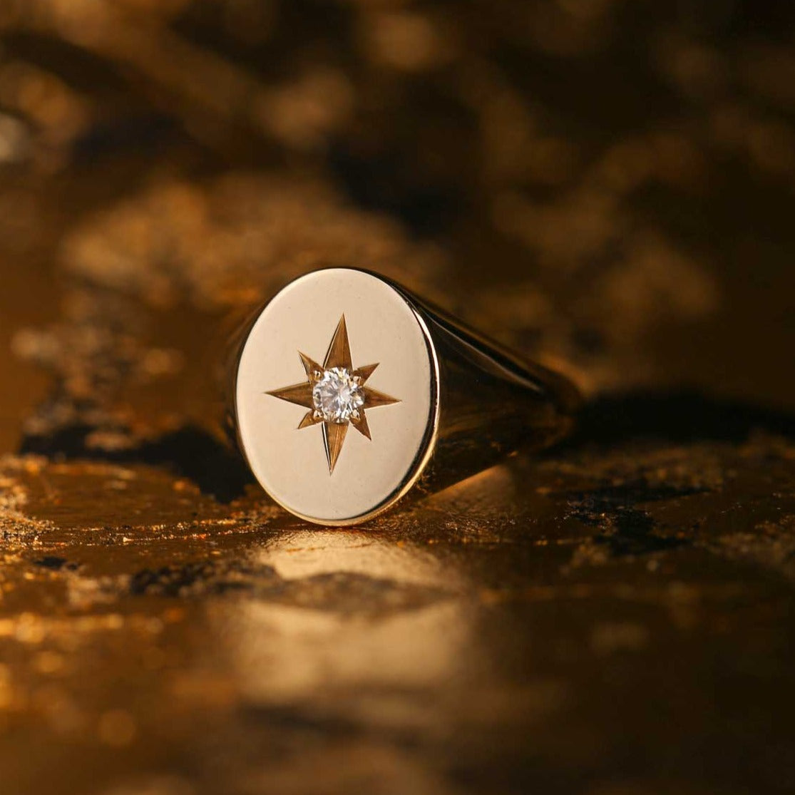 Handcrafted in recycled 9ct yellow gold in our Clerkenwell workshop the oval signet ring is star-set with a 0.06ct diamond.